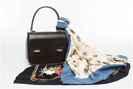 Gucci: lotto composto da una borsa in pelle marrone con chiusura a nodi in metallo dorato e due foulard (lievi difetti)