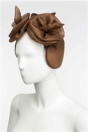 Gallia: cappello in chiffon color tortora con tre fiori (lievi difetti)