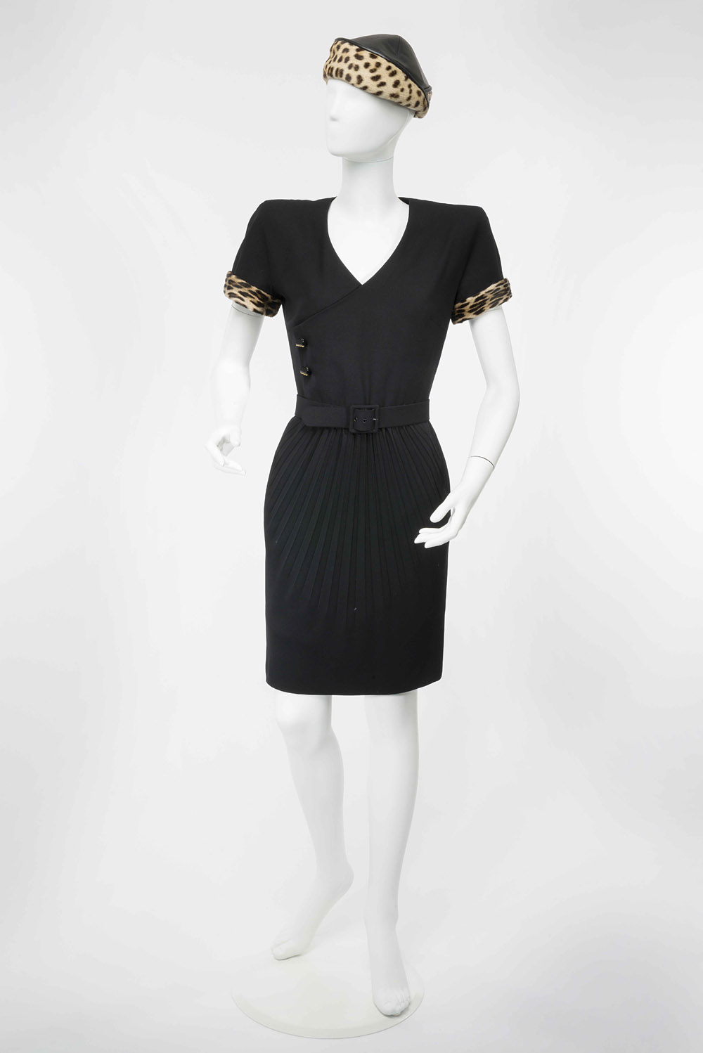 Lotto composto da un abito nero in lana di Raffaella Curiel Milano con allacciatura trasversale e pieghe sul davanti, cintura e bordatura in pelliccia e un cappello abbinato di Gallia e Peter