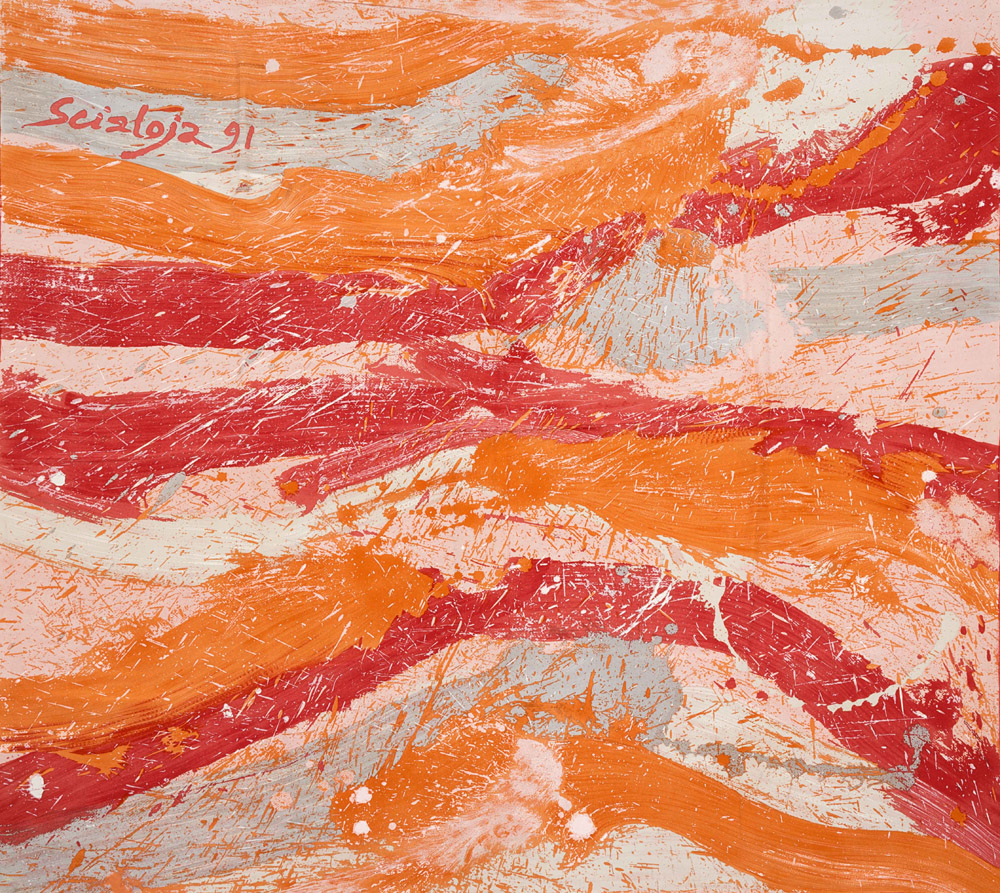 Scialoja 91: foulard in seta sui toni dell'arancio, rosa, rosso e grigio