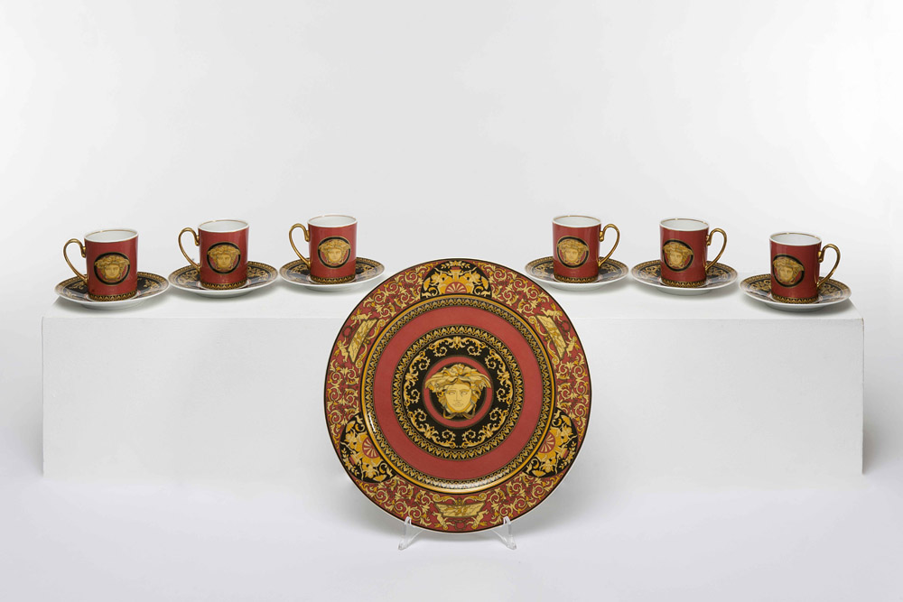 Versace: lotto composto da sei tazzine da caffè con piattini (diam. cm 14) e piatto da parete (diam. cm 30,5) in porcellana Rosenthal policroma con decoro serie Medusa