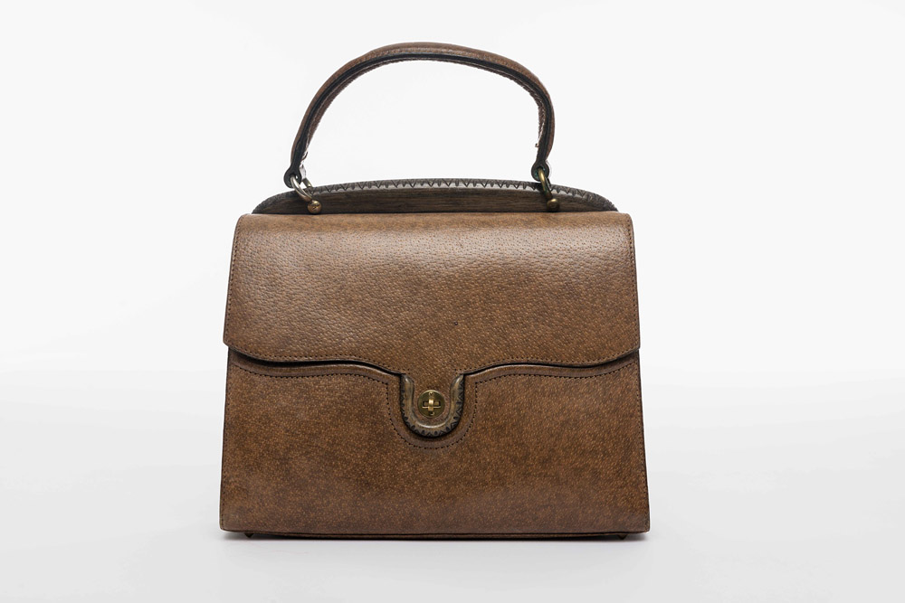 Gucci: borsa in pelle di cinghiale color marrone, manico stondato, chiusura sagomata ed applicazione in legno lavorato, largh. cm 31 (difetti). Mod. Brev. 14-178