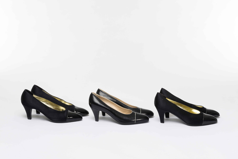 Chanel: lotto composto da tre paia di scarpe in raso di seta e pelle nera, una profilata in avorio, mis. da 37 e 1/2 a 38 e 1/2 (difetti)