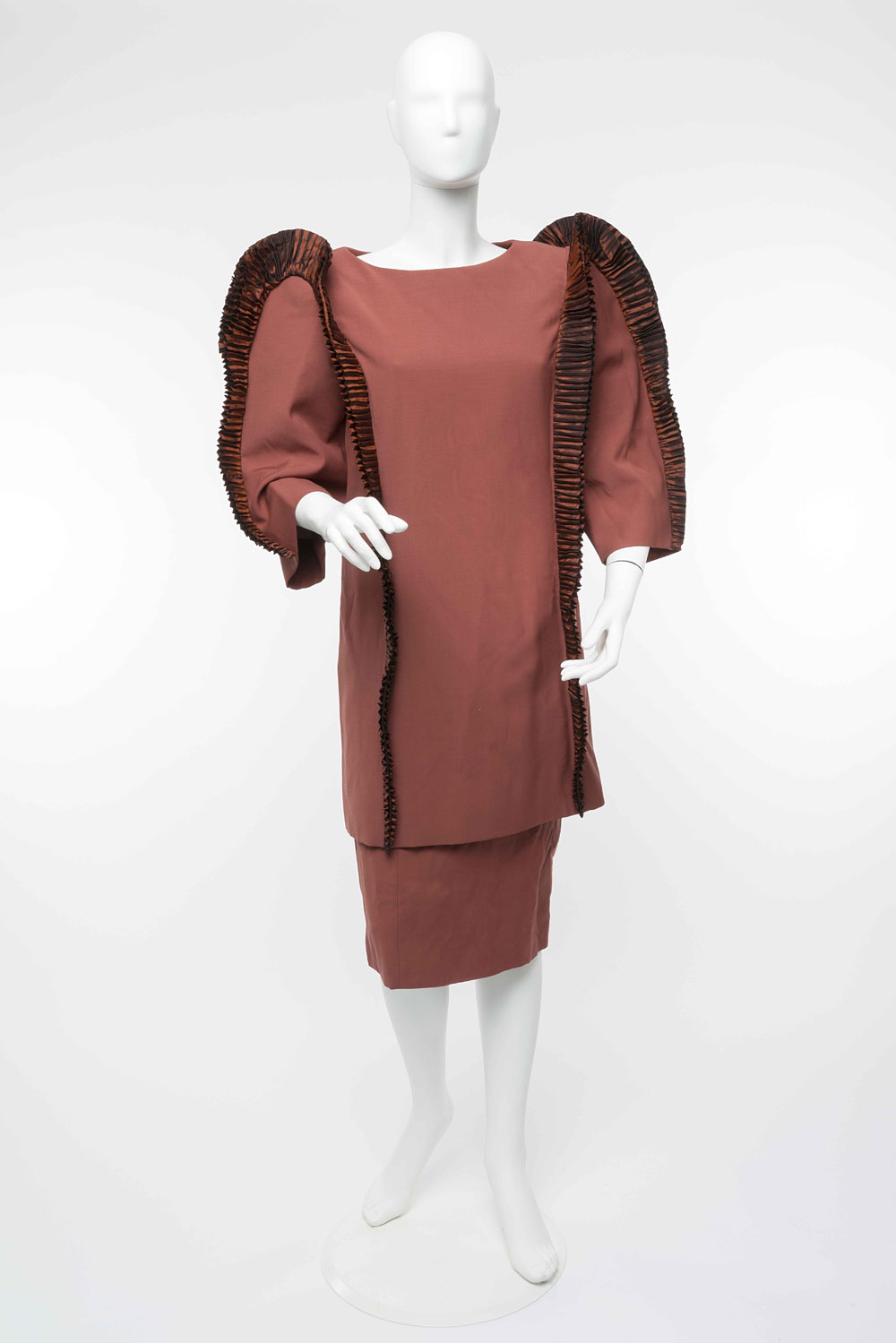 Abito campione per sfilata attribuito a Roberto Capucci composto da blusa e gonna color terra bruciata e rouches in tono plissettate