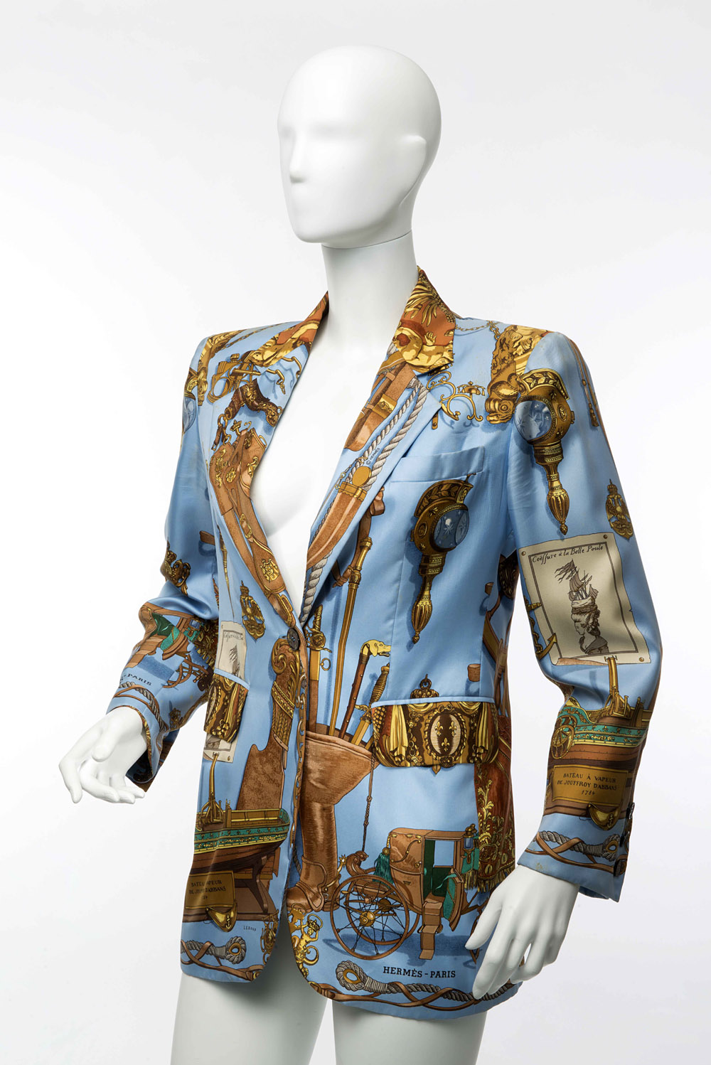 Hermes Paris: giacca in seta stampa "Bateau a vapeur de Jouffroy d'Abbans 1784" sui toni dell'azzurro, Philippe Ledoux, tg 40 (lievi difetti)
