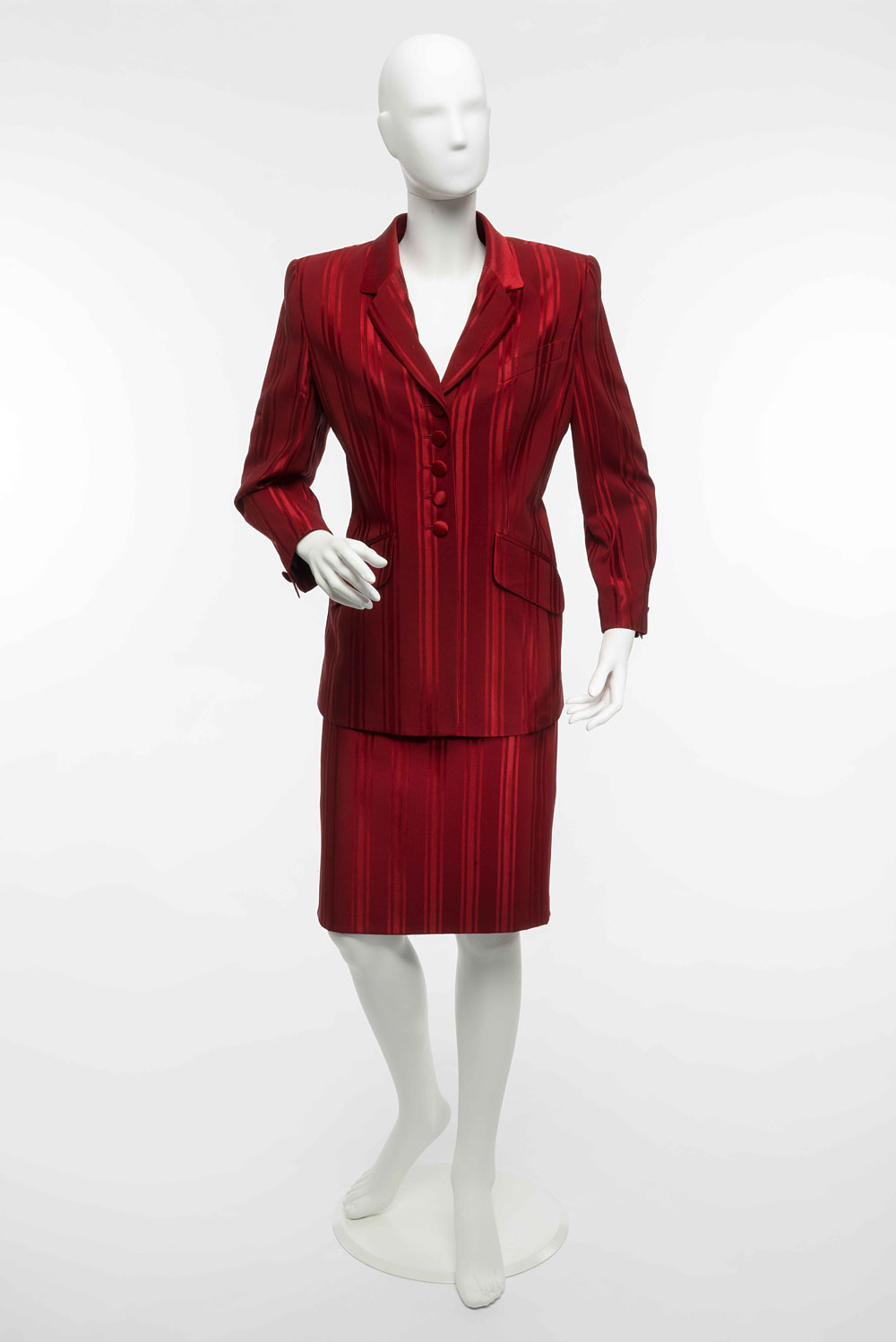 Rena Lange: tailleur gonna in lana misto seta rossa, tessuto motivo rigato ton sur ton, tg 38 tedesca