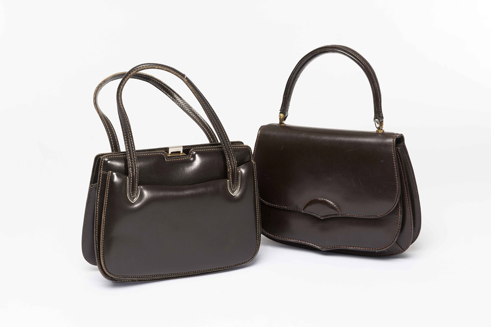 Gucci: lotto composto da due borse in pelle marrone, una con doppio manico e l'altra singolo, rispettivamente largh. cm 24 e 25 (difetti)