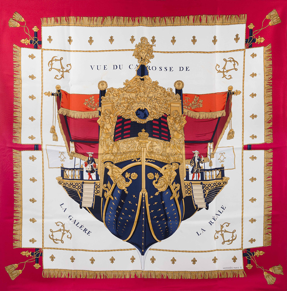 Hermes Paris: foulard in seta stampa "Vue du Carosse de la Galere Reale", toni del rosso, bianco e blu, su fondo bianco e bordo rosso, Hugo Grygkar, 1953 (lievi difetti)