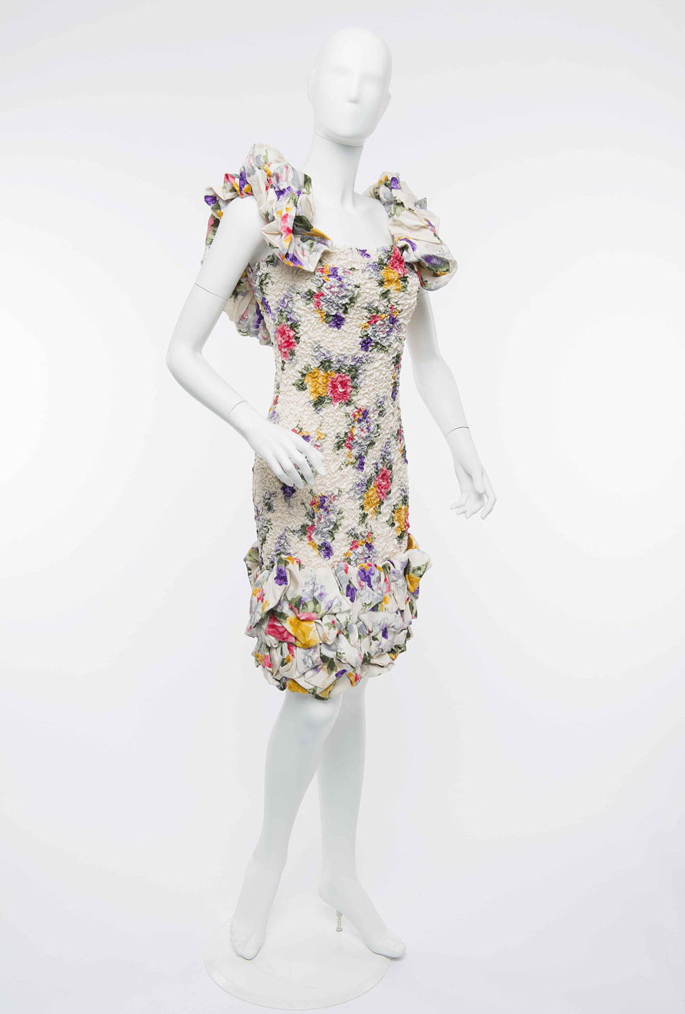 Andrea Odicini: abito cocktail in seta goffrata con disegni floreali su fondo avorio, rouches sulle spalle e balza sul fondo, tg 42