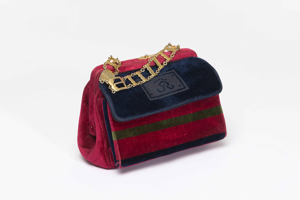 Roberta di Camerino: borsa a mano in velluto color ciliegia, blu e verde, manico a catena color oro e doppio scomparto esterno a soffietto, largh. cm 24
