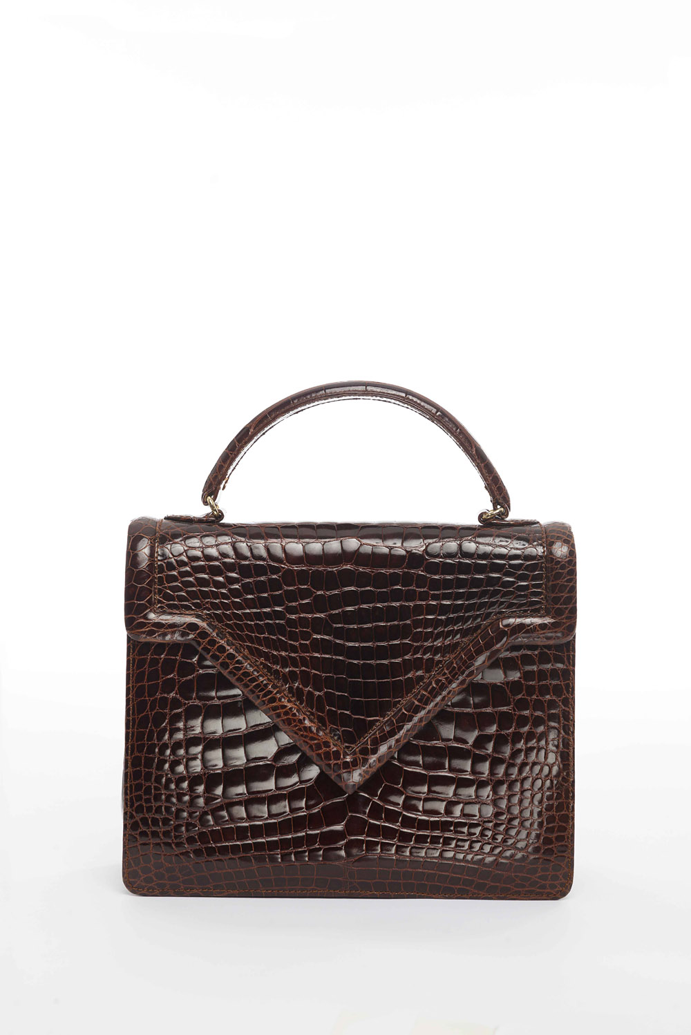 Borsa con manico stondato in coccodrillo color marrone, largh. cm 25. Pre-Convenzione Cites