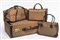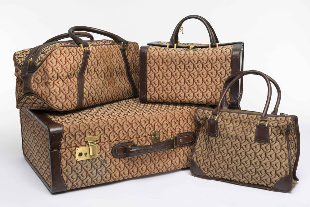 Franzi: lotto composto da una valigia rigida, un beauty-case, un piccolo borsone portascarpe e un borsone in tela monogrammata sui toni del bordeaux e del senape, rifiniture in pelle marrone (lievi difetti)