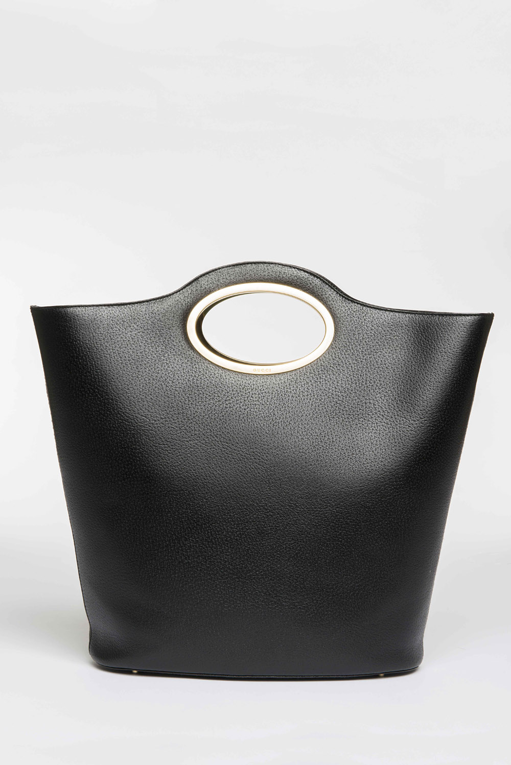 Gucci: borsa a secchiello in pelle nera con rifiniture color oro, largh. cm 43, in sacchetto originale