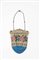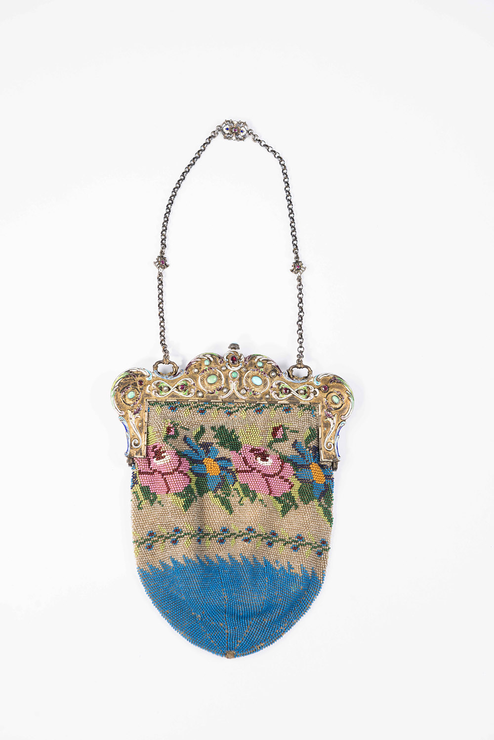 Borsina gioiello lavorata con microperle a formare un disegno floreale e chiusura in argento dorato con smalti, turchesi, perline e catena