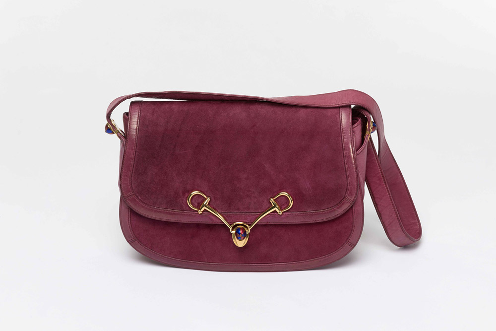 Gucci Equitazione: borsa tracolla in camoscio color amaranto, rifiniture color oro e smalti blu e rosso, largh. cm 27,5 (lievi difetti)