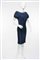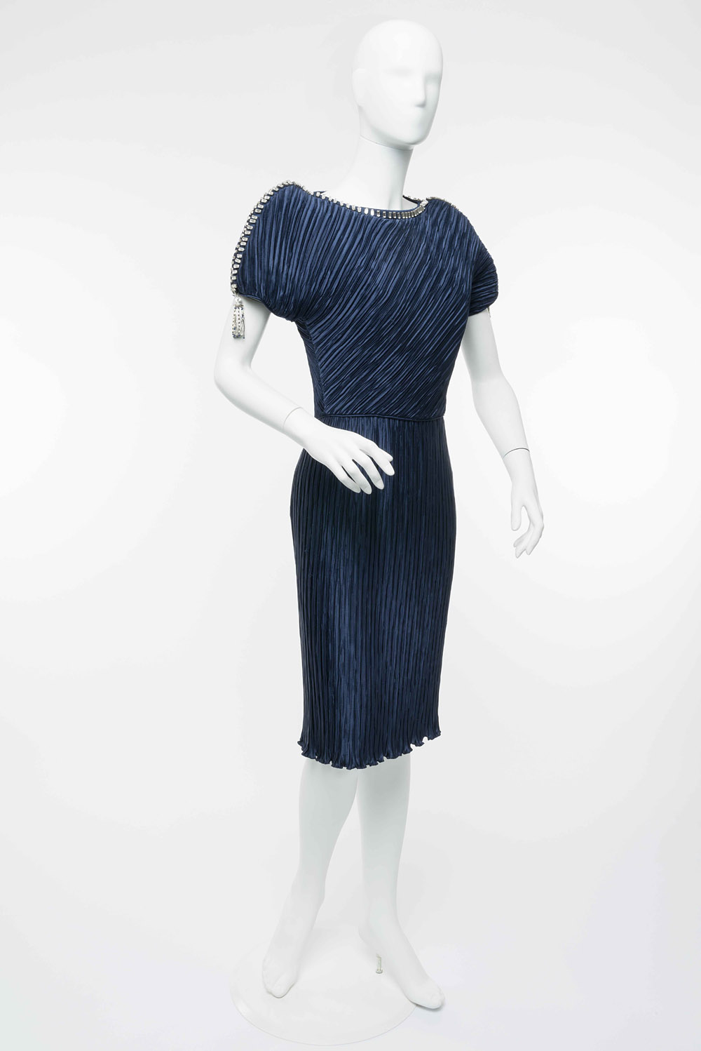 Abito da sera plissettato color blu con cristalli incolori a baguette sullo scollo e le maniche