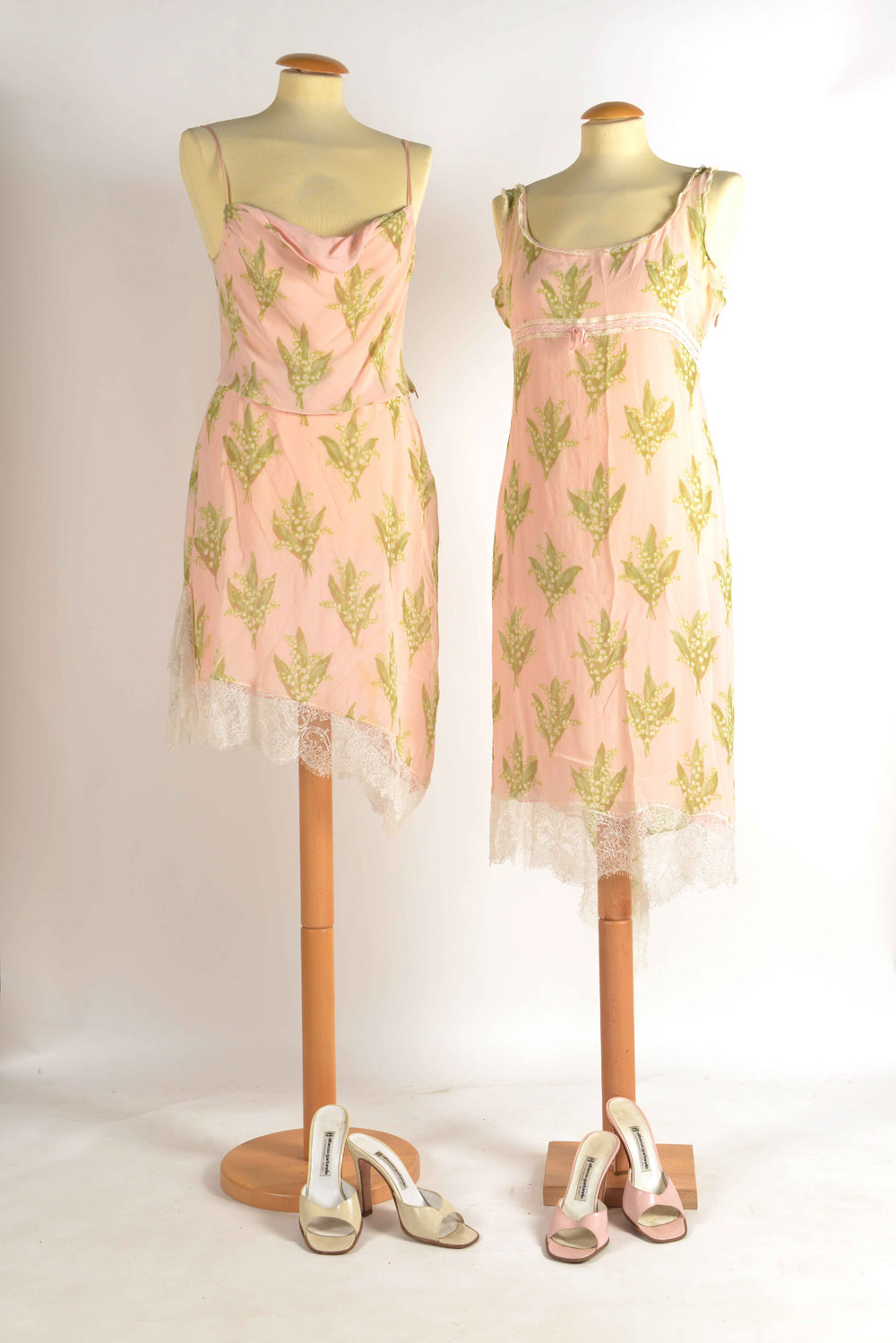 Blumarine: lotto composto da un abito in chiffon rosa con motivo mughetto, bordato in pizzo e sottoveste in crèpe. Due pezzi, canottiera con spalline e gonna asimmetrica, in chiffon rosa e mughetto (tg 44) e due paia di scarpe in pelle rosa e beige, mis. 39