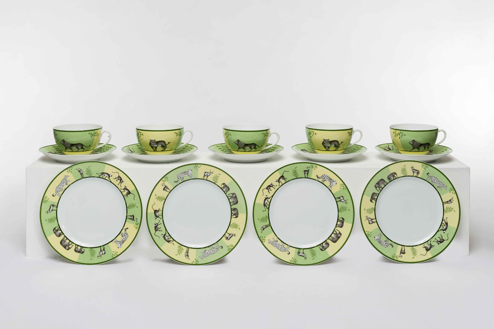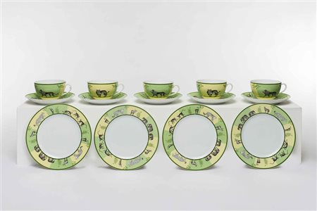Hermes Paris: lotto composto da cinque tazze da tè con piattini (diam. cm 18) e quattro piatti da dessert (diam. cm 22,5) in porcellana policroma con decoro serie Africa