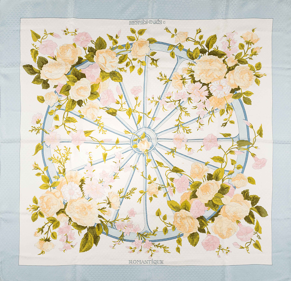 Hermes Paris: foulard in seta stampa "Romantique" colori vari su fondo panna, bordo azzurro, Maurice Tranchant, 1973 (lievi difetti)