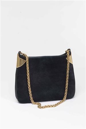 Gucci: borsa in camoscio color blu, con rifiniture e catena color oro, largh. cm 30,5