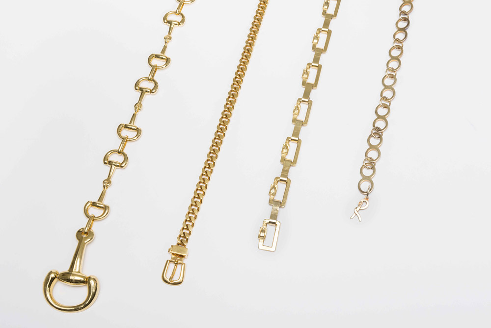 Lotto composto da quattro cinture a catena con maglie e chiusure differenti, tra le quali una di Gucci e una di Roberta di Camerino