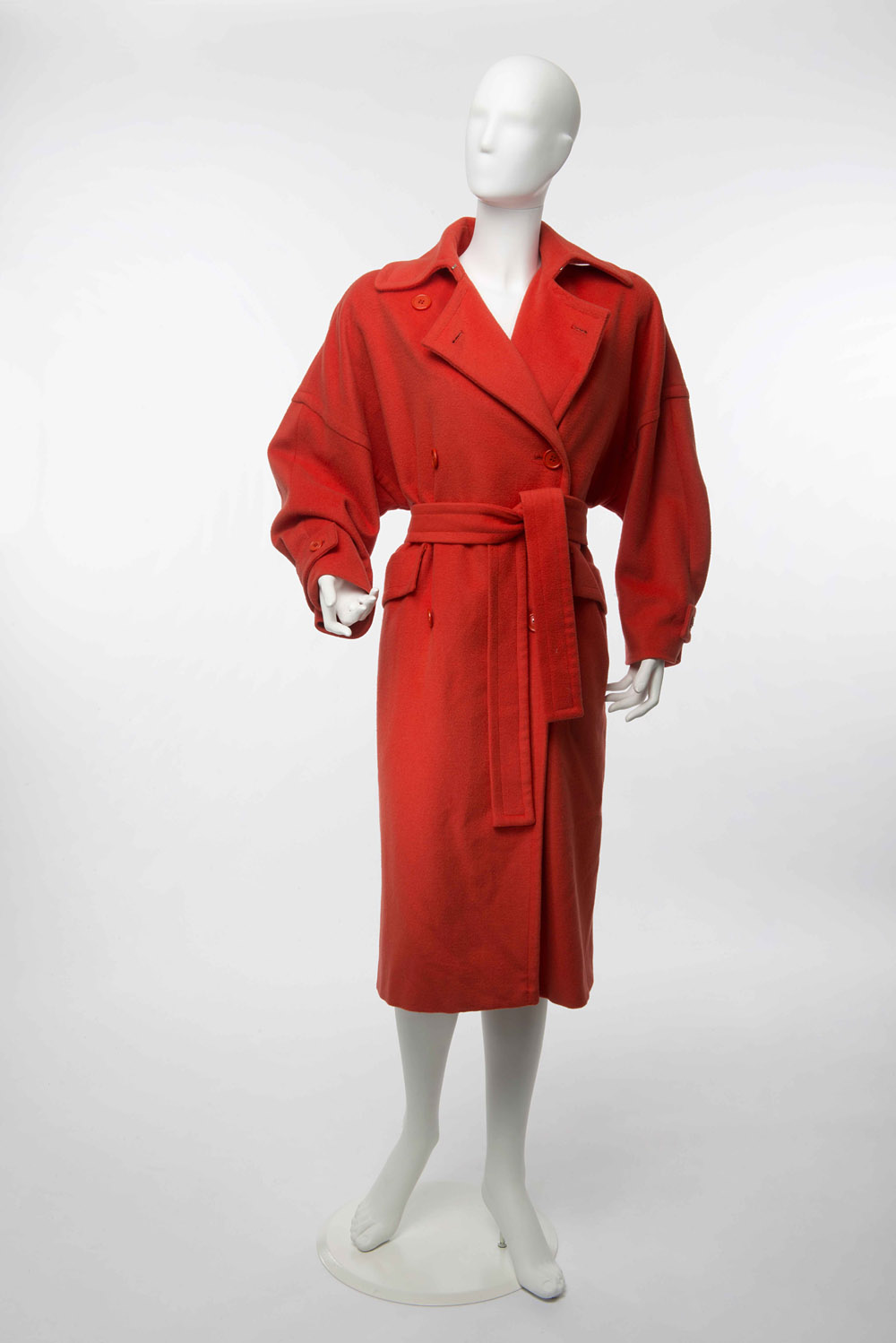Ferrè Studio 0001: cappotto in lana foderata color arancio con cintura, tg 38 (lievi difetti)