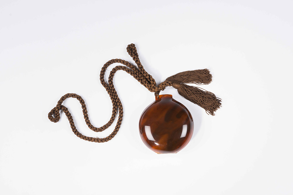 Borbonese: clutch in bachelite forma tondeggiante con chiusura a scatto e tracolla in cordoncino di seta intrecciato, diam. cm 14 (difetti alla base)