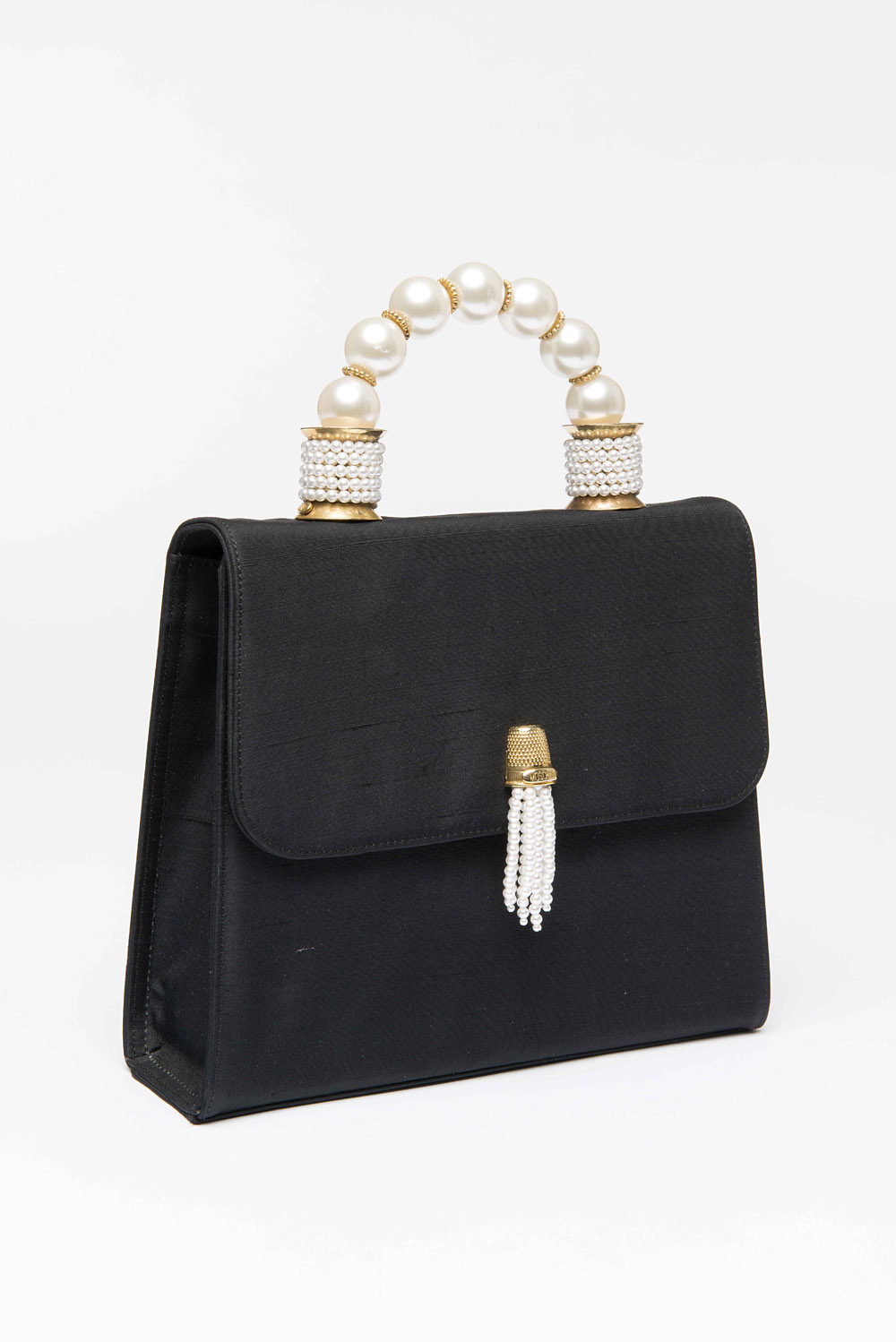 Moschino by Redwall: borsa in seta nera con motivi che richiamano la sartoria, manico formato da sette grandi perle fancy e due rocchetti dorati, decorati con cinque file di perline. Chiusura a scatto con motivo a ricordare un ditale da cucito e fili di perline, largh. cm 23 - Edizione limitata N 463007.