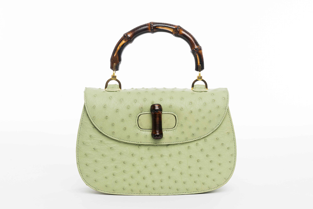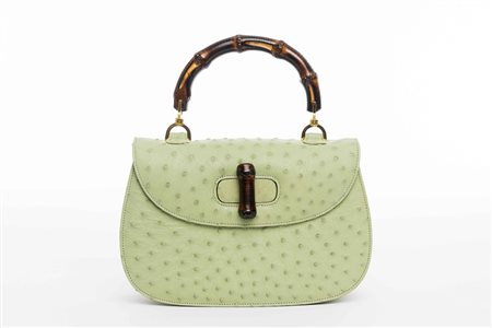 Gucci: borsa Bamboo in struzzo color salvia, largh. cm 27, in sacchetto e scatola originali