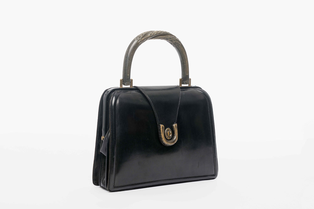 Gucci: borsa in pelle color nero manico stondato e chiusura sagomata in legno lavorato, largh. cm 27. Mod. Brev. N. 72-649