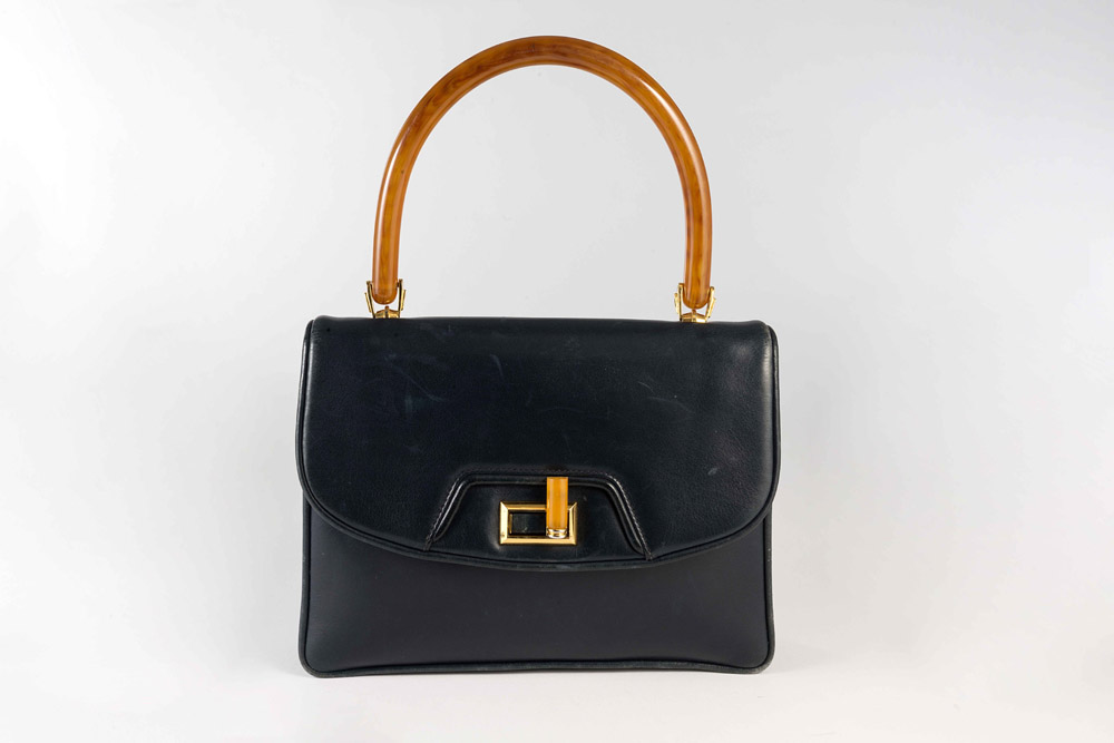 Gucci: borsa in pelle blu con manico rigido in bachelite color ambra come la chiusura, largh. cm 22 (lievi difetti) Il ricavato della vendita di questo lotto sarà devoluto al Progetto della Nuova Casa Pediatrica, Ospedale Fatebenefratelli di Milano.