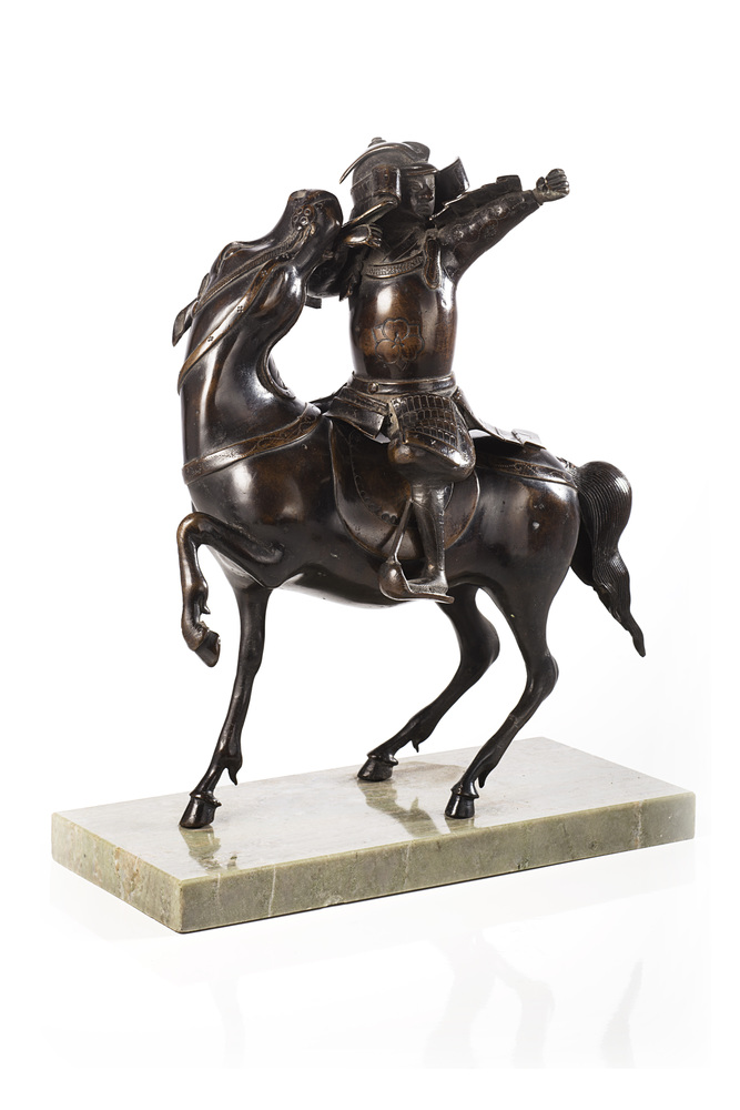 Scultura in bronzo composta da due parti, raffigurante un giovane samurai su cavallo (mancanza e restauro) Giappone, periodo Meiji (1868-1912) A bronze sculpture modelled as a samurai riding a horse (restoration) Japan, Meiji period (1868-1912) (h. 27,5 cm.)