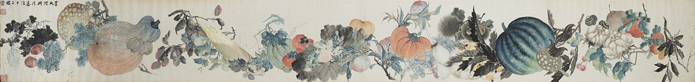 Dipinto raffigurante frutti e verdura delle quattro stagioni, con iscrizione e sigilli, inchiostro e colori su carta, montato incorniciato Cina, prima metà sec. XX A painting of fruit and vegetables, with inscriptions and seals, ink and colours on paper, mounted and framed China, first half of the 20th century (200x24,5 cm.)