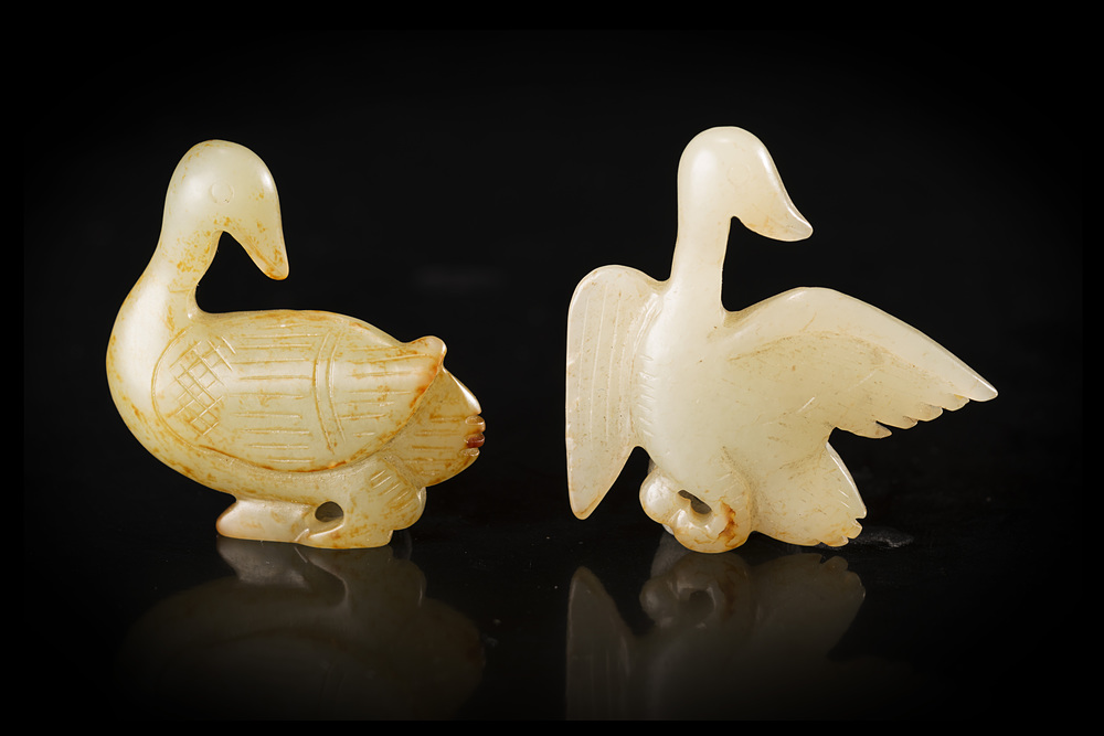 Coppia di ornamenti per cappello in giada color celadon, raffiguranti due anatre, una in volo, una stante, la pietra con naturali inclusioni e venature color ruggine, ciascuna con buchi sul retro Cina, sec. XIX A pair of small jade hat ornaments, depicting two geese, one in flight one standing, the stone with natural flaw lines and russet inclusions, each with pierced holes to the base China, 19th century (l. 3,5 cm.)