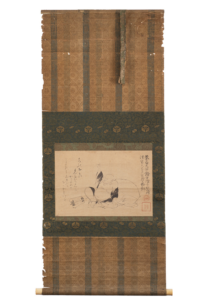 Dipinto raffigurante Budai seduto con espressione gioviale, con iscrizioni e...