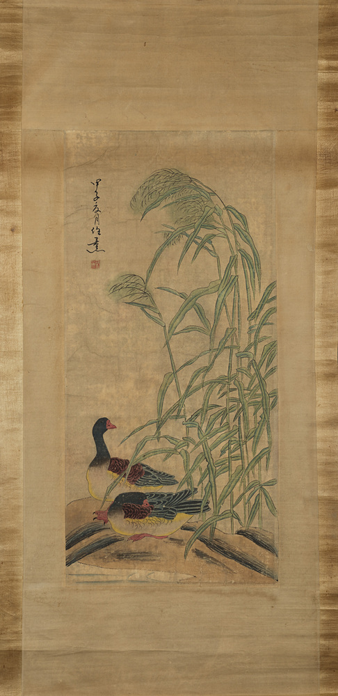 Dipinto su scroll verticale con due anatre tra le foglie, con iscrizione e...