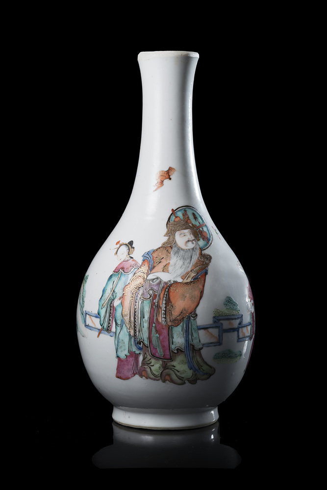 Vaso a bottiglia in smalti Famiglia Rosa decorato in smalti e dorature con un officiale e altre figure in un giardino recintato (piccolo difetto) Cina, periodo Kangxi (1662-1722) A Famille Rose bottle vase, decorated in enamels and gilt with an official and attendants in a fenced garden (flaws to the mouth) China, Kangxi period (1662-1722) (h. 20 cm.)