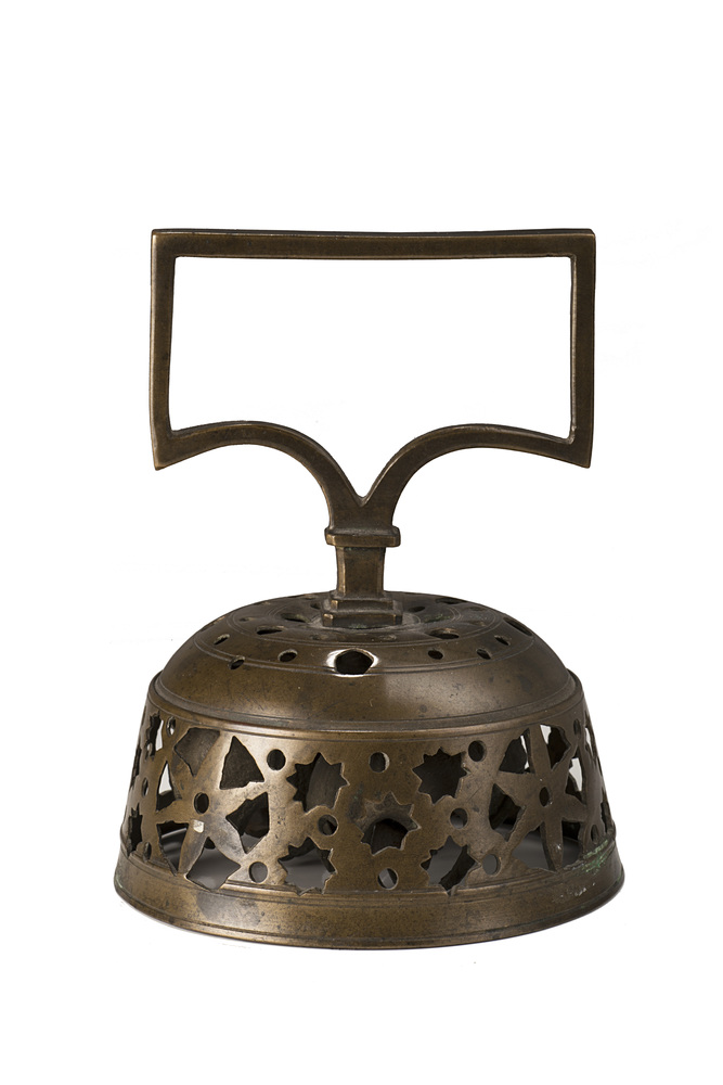 Campana in bronzo traforato e lavorato a motivi geometrici con tre sonagli e presa rettangolare Tibet, secc. XVIII-XIX Provenienza: "Collection E. Imbert Milan n°1671", etichetta alla base A bronze bell with geometric decoration, with three chimes and a rectangular handle Tibet, XVIII/XIX century Provenance: "Collection E. Imbert Milan n°1671", label to the base (h. 11,5 cm.)