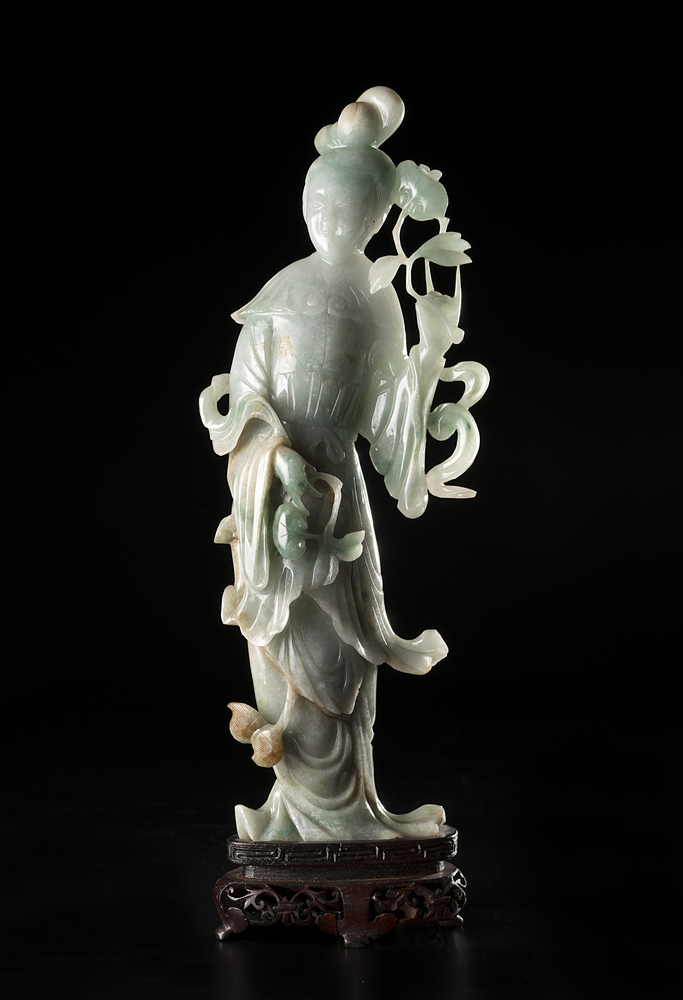 Scultura in giadeite raffigurante una donna con capelli raccolti, indossa lunghe vesti e porta rami di lingzhi, con base di legno, la pietra di varie tonalità di verde e ruggine, con difetti naturali Cina, dinastia Qing, sec. XIX Provenienza: una collezione privata milanese, acquisito inizio XX secolo in Cina A jadeite figure of a lady with knotted hair, wearing long flowing robes and carrying lingzhi branches, with wood stand, the stone of green and rust tones with natural flaws China, Qing dynasty, 19th century Provenance: a private Milanese collection, acquired in the early 20th century in China (h. 24 cm.)