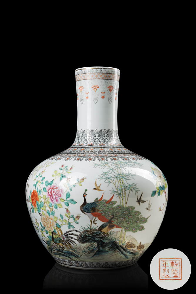 Grande vaso a bottiglia tianqiu in smalti Famiglia Rosa, decorato con pavoni e altri uccelli tra alberi e fiori, il collo con motivi geometrici in smalti en-grisaille (restauro) Cina, periodo della Repubblica (1912-1949) A tianqiu bottle vase decorated in Famille Rose with peacocks and birds amongst flowers, the neck with an en-grisaille decoration (restoration) China, Republic period (1662-1722) (h. 60 cm.)