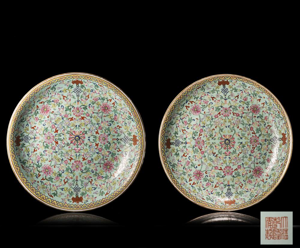Coppia di grandi piatti in porcellana in Famiglia Rosa su fondo turchese, decorati con fiori di loto, pipistrelli e nodo buddhista, contornati da fitto fogliame, il bordo con teste di ruyi, la base turchese con marchio apocrifo Qianlong (lievi mancanze e difetti della doratura) Cina, inizio sec. XX A pair of turquoise ground Famille Rose large dishes, decorated with lotus flowers, bats and Buddhist "endless knots" interspersed with dense scrolling foliage, the turquoise base with apocryphal Qianlong mark (minor losses and flaws to the gilt) China, early 20th century (diam. 39,5 cm.)