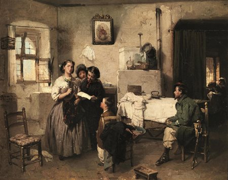 Domenico Induno(Milano 1815 - Milano 1878)TRE DONNE CHE LEGGONO UNA LETTERA o...