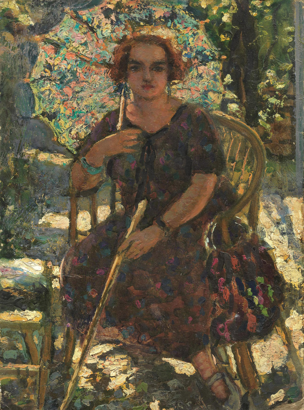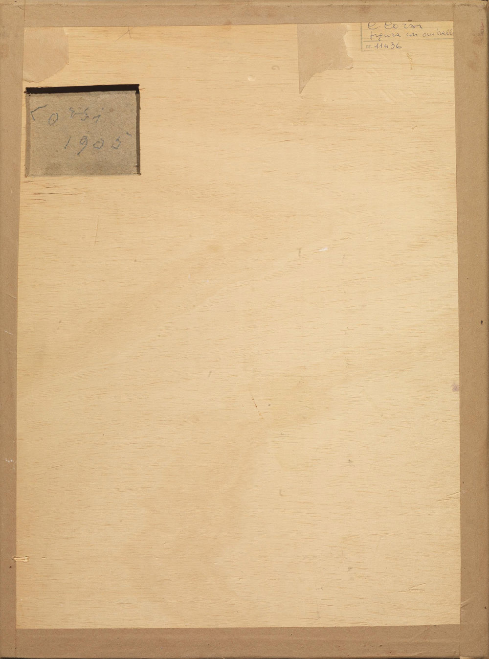 Carlo Corsi(Nizza 1879 - Bologna 1966)FIGURA CON OMBRELLINOolio su cartone,...