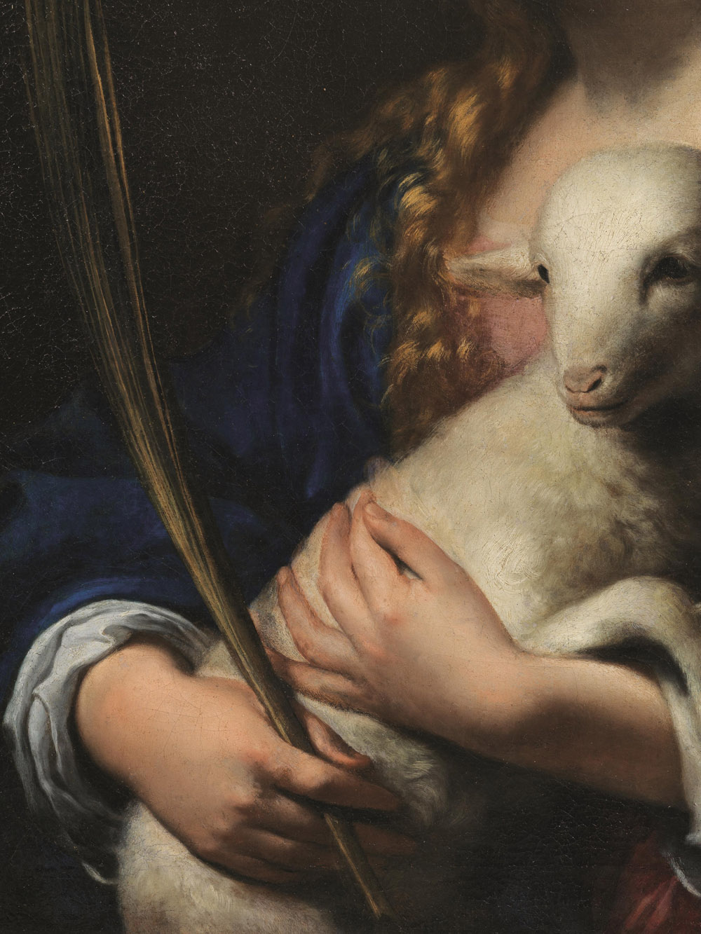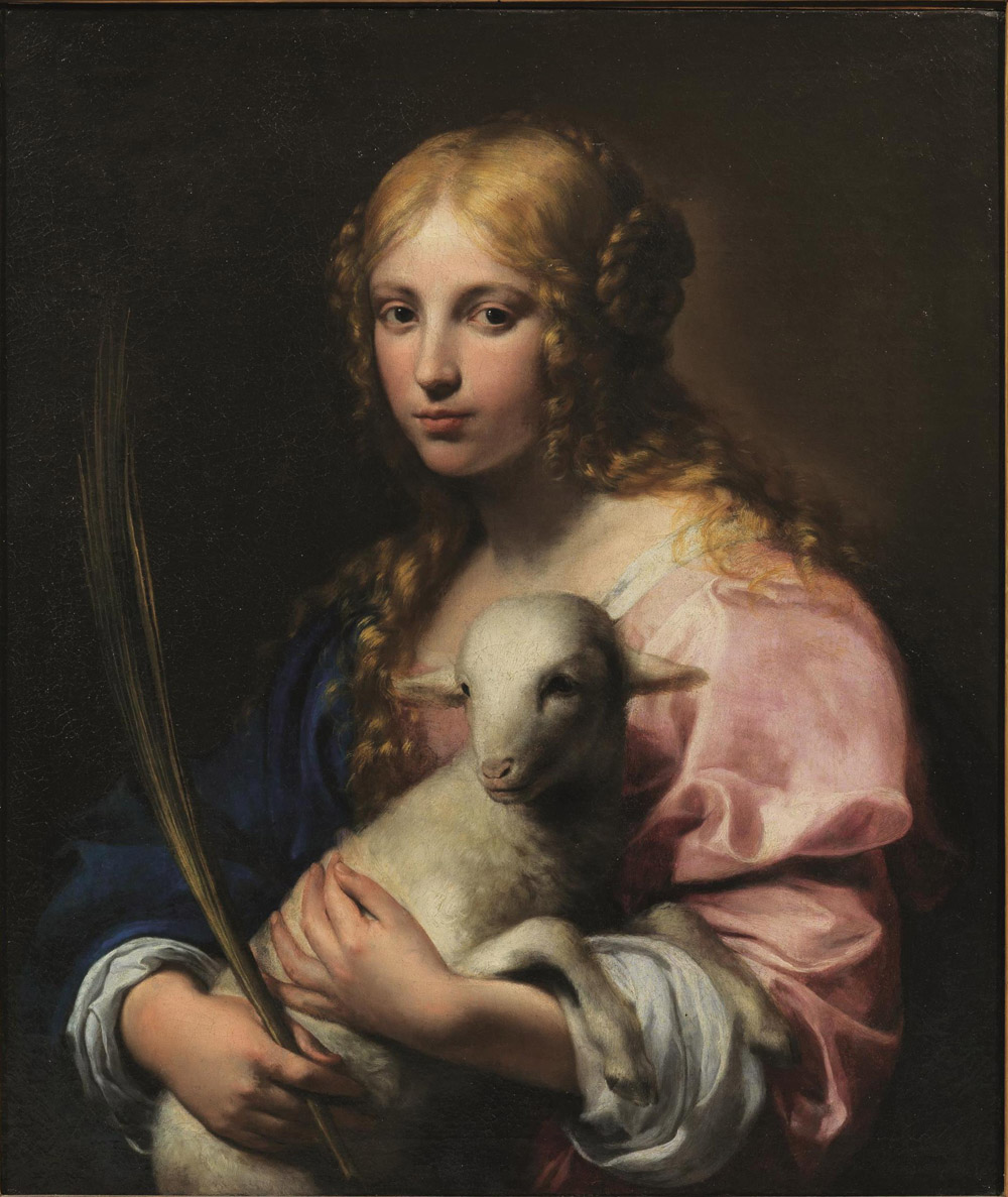 Il dipinto raffigura una giovane donna elegantemente abbigliata, facilmente identificabile in Sant''Agnese per la presenza della palma del martirio nella mano destra e dell''agnello, caratteristici attributi iconografici della giovanissima martire cristiana, uccisa a causa della propria fede durante le persecuzioni di Diocleziano all''inizio del IV secolo d.C.