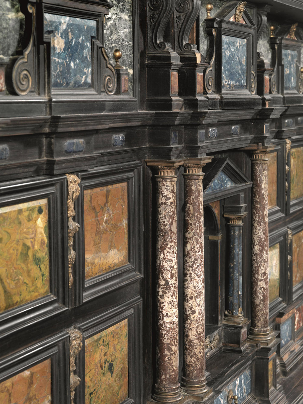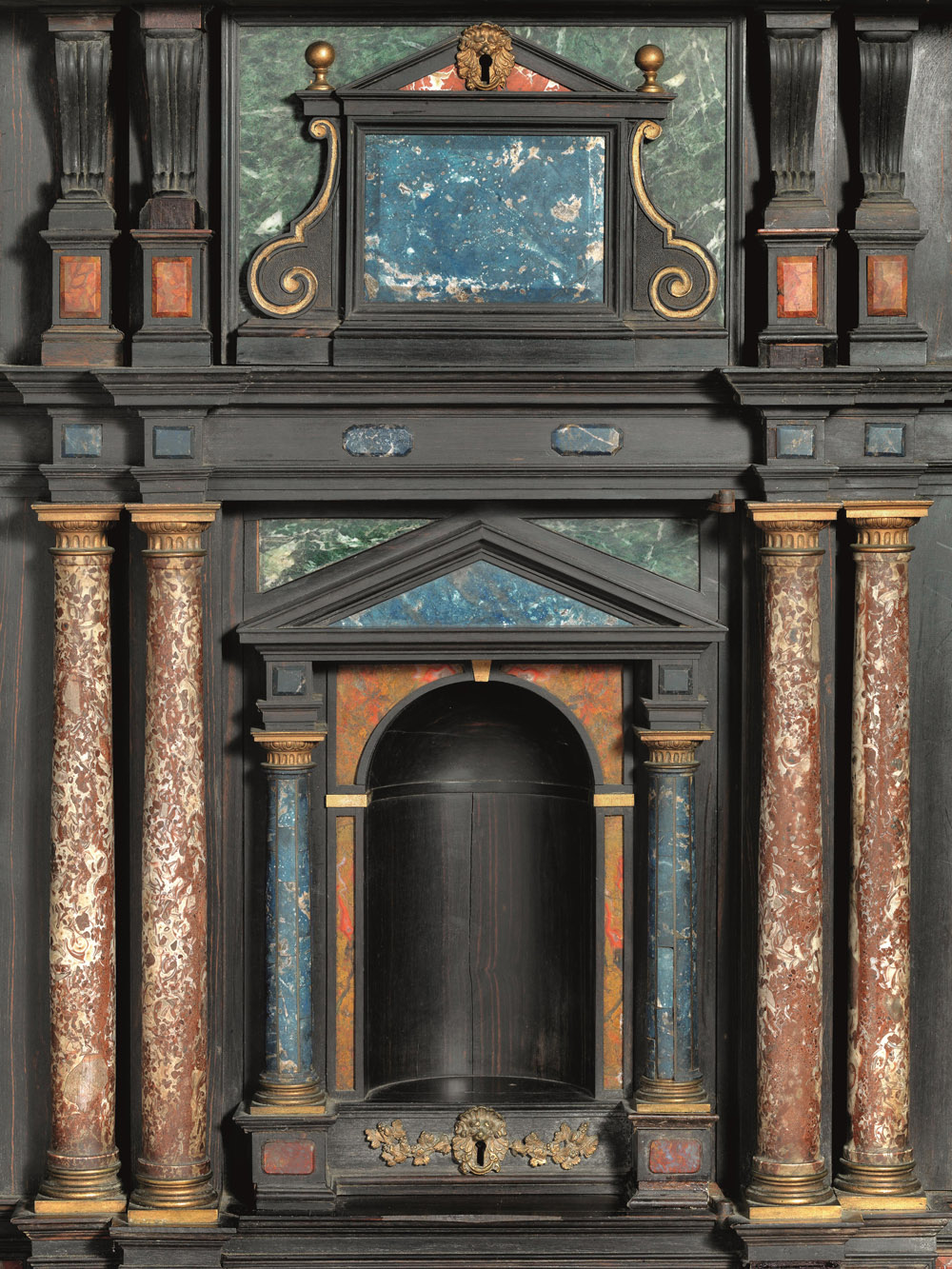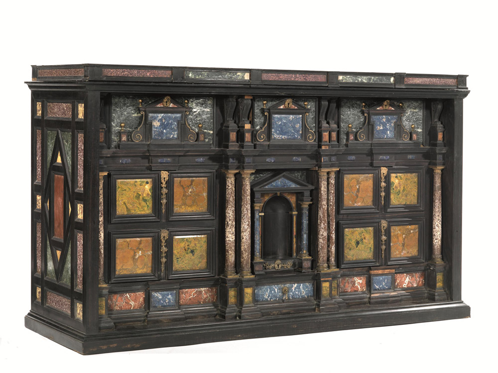 in legno decorato in pietre dure e marmi con applicazioni in bronzo, di forma architettonica con fronte a otto cassetti e anta centrale sormontata da timpano e inquadrata da due colonne celante altri dodici cassettini con pomelli in avorio, uno dei cassetti reca un cartiglio con scritta "Cav. Giovanni Battista Gatti - intarsiatore in avorio ebano pietre dure ecc. - Via Sistina 47", cm 77x133x42