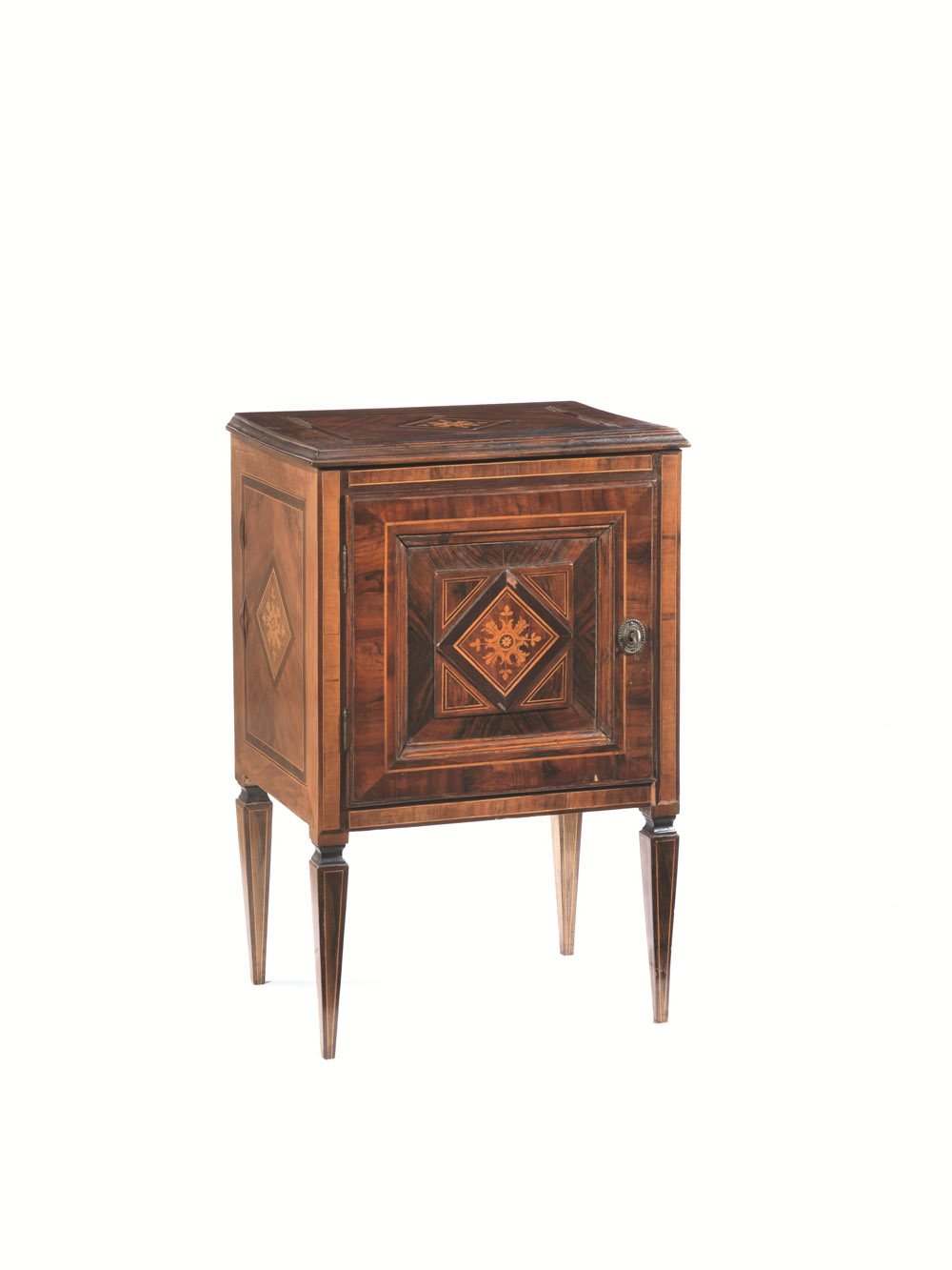 COMODINO, LOMBARDIA, INIZI SECOLO XIX in noce intarsiato, fronte a uno sportello con decoro romboidale a motivi vegetali, piano e fianchi analogamente decorati, gambe troncopiramidali, cm 74x47x35,5