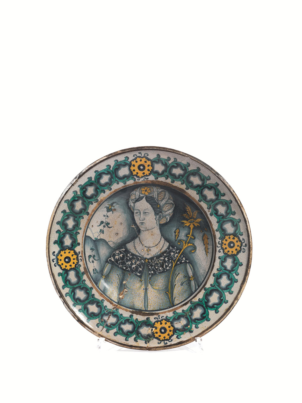 in maiolica dipinta in policromia su smalto stannifero con azzurro, verde rame, blu di cobalto, giallo antimonio; retro smaltato. Il centro del cavetto mostra una decorazione con figura di donna con turbante raffigurata di fronte con un abito chiuso, un ramo fiorito e un paesaggio collinare di sfondo. La tesa invece porta un decoro a corona di spine centrata nei punti cardinali da fioretti multipetalo. Questa scelta iconografica è spesso rappresentata in opere delle botteghe derutesi con variante nella scelta decorativa della tesa e della cromia, con o senza lustro. Lo stile pittorico è sicuro, l’impostazione decorativa è ricca e complessa, il tratto molto delicato e sottile specialmente nella resa dei tratti somatici e dei particolari dell’abito; degna di nota l’ombreggiatura blu nelle corona sulla tesa; alt. cm 9,2, diam. cm 41,5, diam. piede cm 13,6