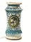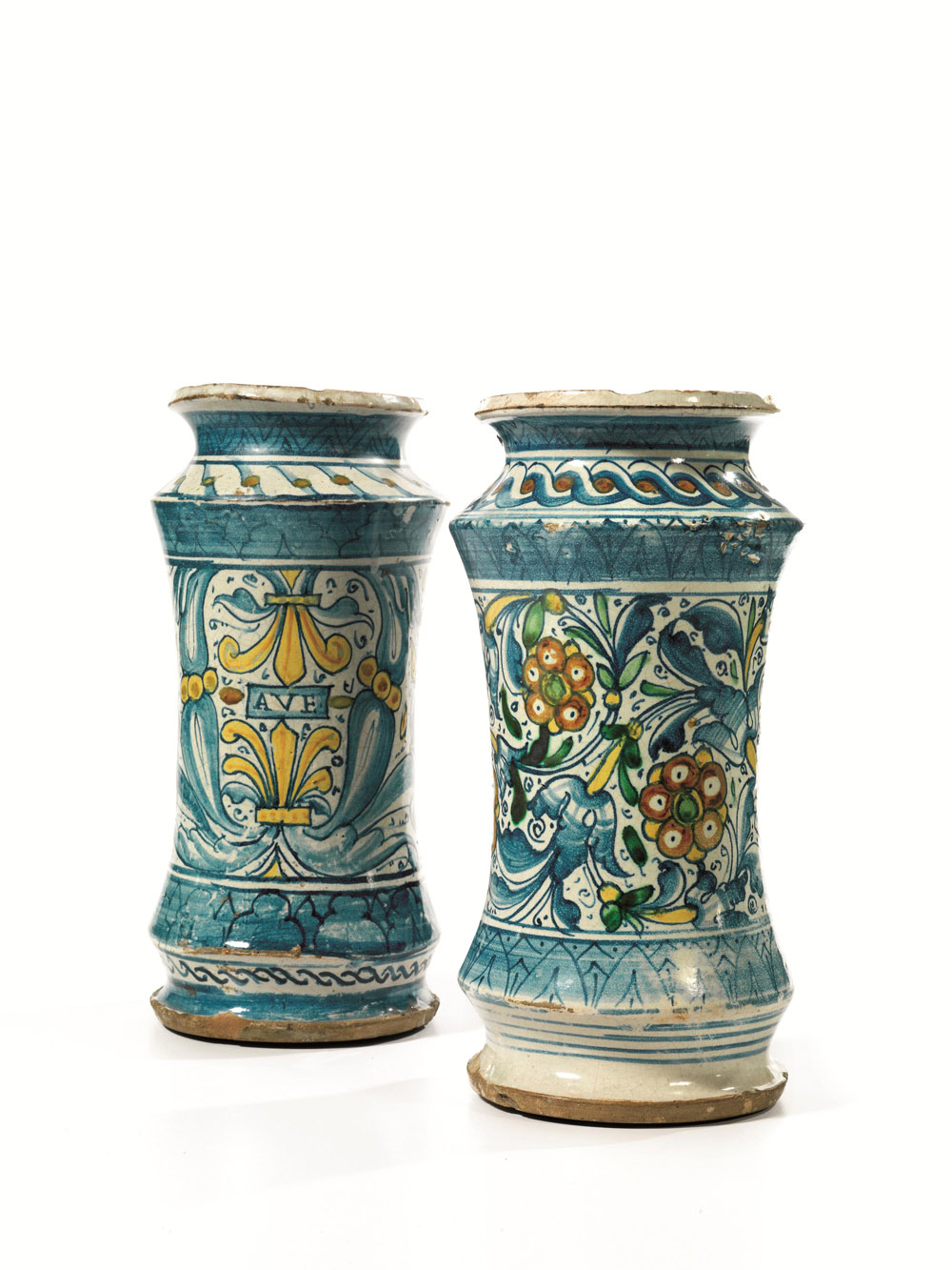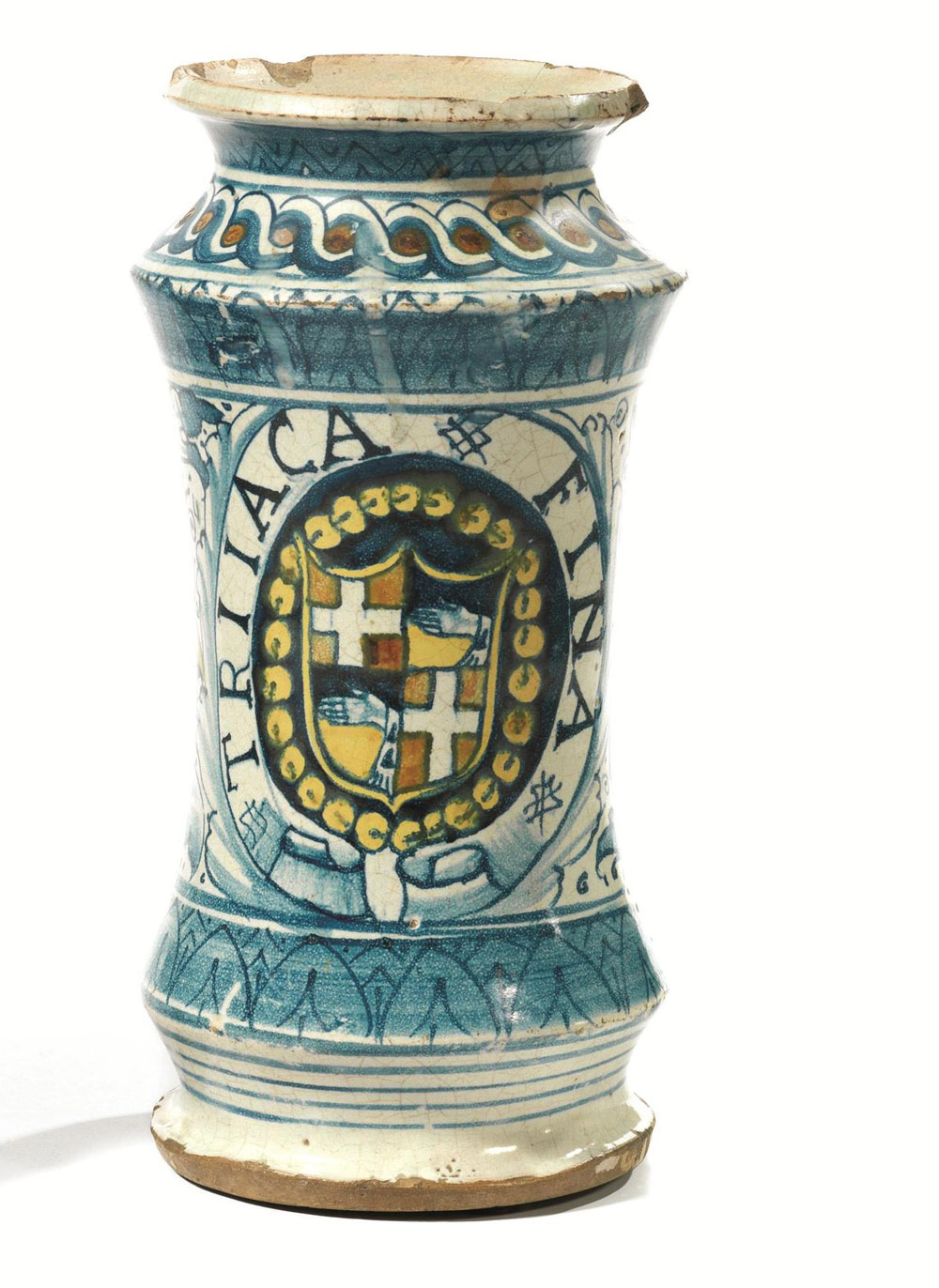in ma iolica decorata in policromia , corpo cilindrico rastremato al centro, spalla pronunciata con profilo inclinato e stacco fortemente angolato. L’imboccatura è larga , poggiante su un collo basso, con orlo tagliato a stecca dal profilo aggettante. Il piede è basso, a base piana con orlo tagliato a stecca. Il corpo ceramico color camoscio scuro è coperto di smalto bianco spesso anche all’interno del vaso. La decorazione, coerente con quella dell’esemplare che precede mostra fasce parallele che dal collo , listato in blu con una sottile decorazione a dente di lupo , scendono formando sulla spalla un decoro a catena continua centrata da tocchi di rosso ferro, cui fa seguito, sul corpo, una fascia dal caratteristico decoro a foglie lanceolate, una larga fascia che reca al centro un medaglione che contiene l’emblema del gran maestro dell’ordine di Malta, circondato dal rosario e compreso in un cartiglio che reca la scritta farmaceutica “ TRIACA FINA in caratteri capitali. Intorno a l medaglione e sul retro si sviluppa un motivo a girali fogliate arricchite da fioretti multipetalo color giallo arancio. Segue un '' ultima fascia a fogliette lanceolate. Tradizionalmente attribuiti alle botteghe trapanesi , ci pare invece che per forma e caratteristiche decorative l’opera si possa inserire nella produzione di manifatture derutesi o di maestranze attive nella zona dell’Umbria e Alto Lazio. La datazione dell’opera deriva poi chiaramente dallo stemma , che fa riferimento a Villiers de L''Isle-Adam, Gran Maestro dei Cavalieri Ospitalieri di San Giovanni e poi di Malta (1521-1534). Il suo nome è legato al momento in cui i Cavalieri Ospedalieri , messisi in salvo dopo l’assedio di Rodi a opera di Solimano il Magnifico , soggiornano brevemente a Viterbo prima e a Nizza poi, per trovare definitivo rifugio ad opera di Carlo V nell’arcipelago di Malta , ove rimarranno con vera indipendenza statuale fino al 1798, quando a seguito dell’editto di Napoleone non esisterà più un''entità territoriale statale dell''ordine; a lt. cm 24,8; diam. bocca cm 11; diam. p iede cm 11,3.