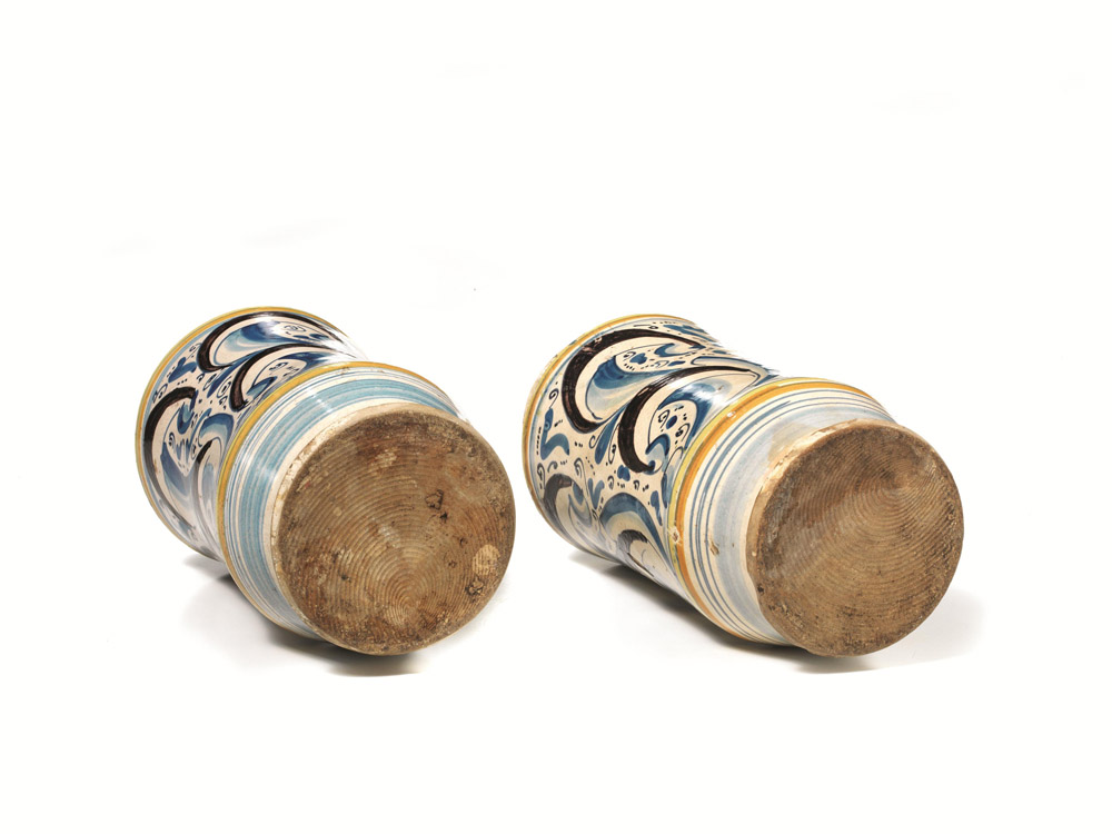 in maiolica decorata in policromia, corpo cilindrico con base carenata e piede piano; spalla stretta e alta molto inclinata, bocca ampia con orlo appena estroflesso e orlo a taglio netto. La superficie degli albarelli è interamente ricoperta da smalto color crema, su cui è tracciato con ampie pennellate un motivo a “decoro invadente” associato a un motivo a linee parallele che corre sul collo e sulla spalla. Si tratta di una estenuazione dei motivi decorativi rinascimentali che fa seguito alla crisi economica che si verificò nell’area fiorentina nel corso del XVI secolo e comportò una minore vivacità creativa nelle botteghe montelupine, che ripetono motivi decorativi di grande successo nelle produzioni precedenti: ciò giustifica quello che potrebbe intendersi come una modalità pittorica più corriva, alt. cm 24,5, diam. base cm 9,2, diam. bocca cm 9,2