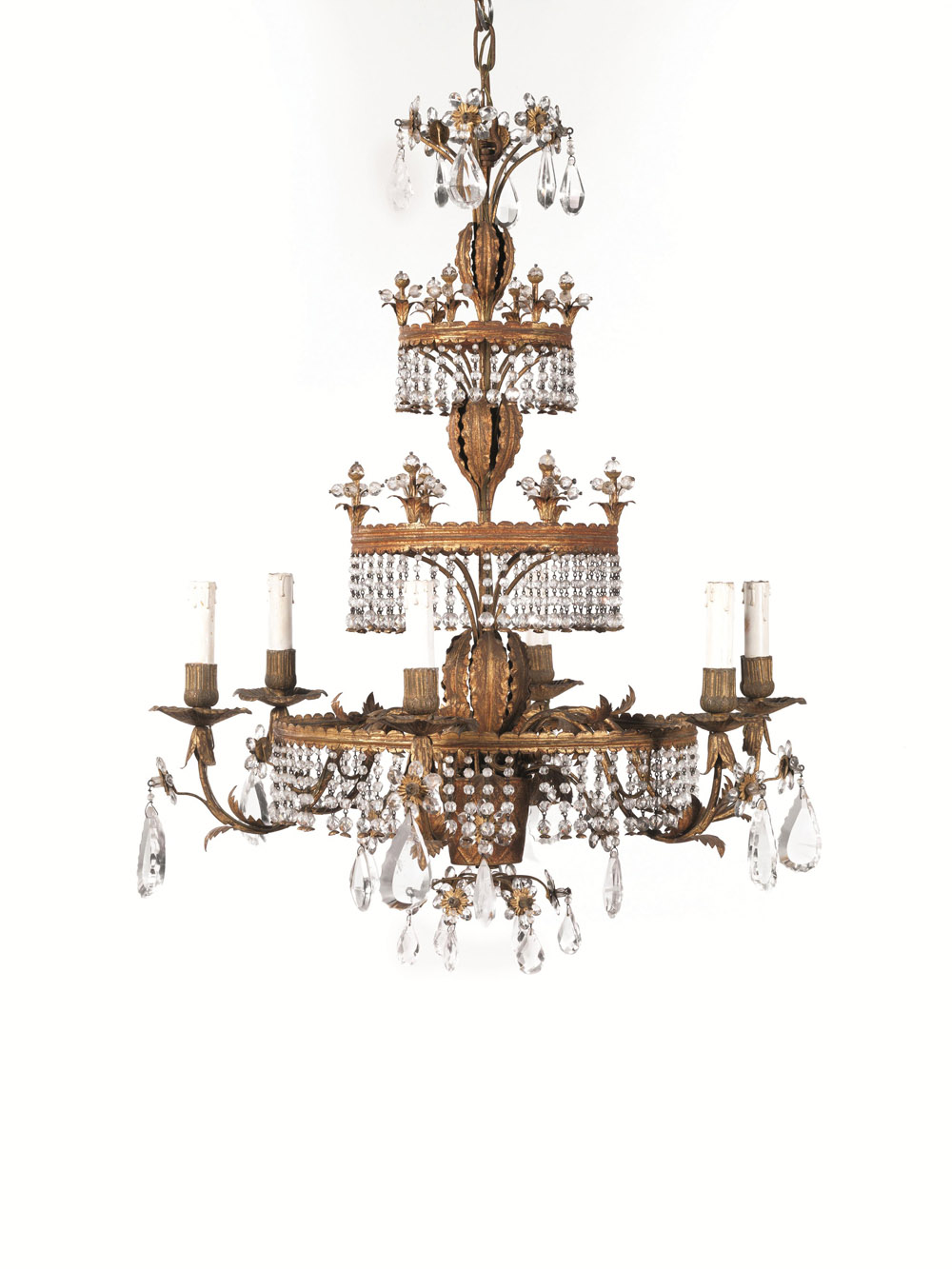 in metallo dorato e cristallo, corpo caratterizzato da tre palchi circolari di dimensioni crescenti impreziositi da pendenti in cristallo e suddivisi da foglie stilizzate; sei luci sul palco inferiore su bracci decorati a tralci vegetali arricchiti da gocce in cristallo, alt. cm 90, diam. cm 70
